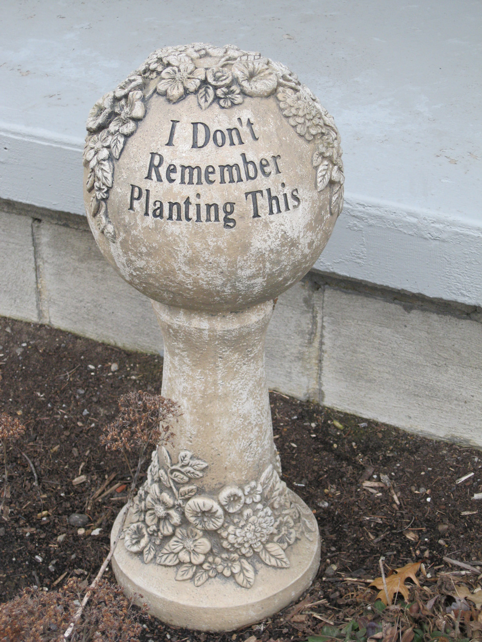 Years ago I got home from work and my mother was waiting, she had dinner on the table and told me to hurry up, change and eat because she wanted to go to the garden center before it closed to pick something up. She was so excited but she wouldn't tell me what she bought, only that it was the only one they had. What she bought was a garden ornament shaped like a gazing ball on a column, only it was made out of cement and said "I don't remember planting this" It was her pride and joy. it was heavy and every year I had to move it onto our covered patio for the winter. Now it is in my front garden standing over a patch of bulbs I planted. I figured well, she won't remember planting THESE! Here's to you Mom! Thanks for all the sewing, cooking and gardening lessons.