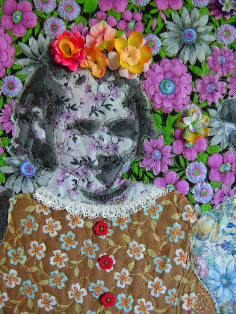 Four Girls in the Garden. A breath of spring time. I had a photo printed at Spoonflower but felt the faces were too dark so I printed them on flowered fabric on my home printer. Then the dresses were a bit depressing so I made patterns and cut them new dresses. I then printed arms and hands on more flowered fabric. Some embellishments and silk flowers later, this appeared. Fun!